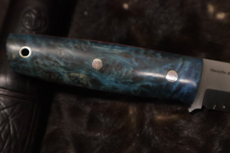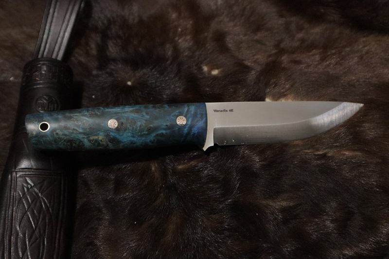 Vanadis 4E steel-63hrc. Blade is 108 mm. and handle 110 mm.- linden burl. thickness 5mm. leather sheath. scandivex grind. Finish - satin. US customers should pay 15% of the price before shipping, due to two newly added taxes between the US and the European Union