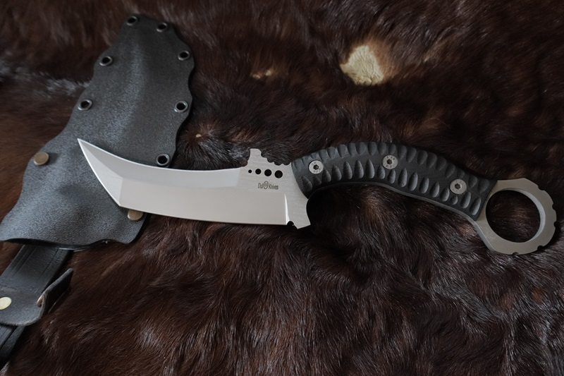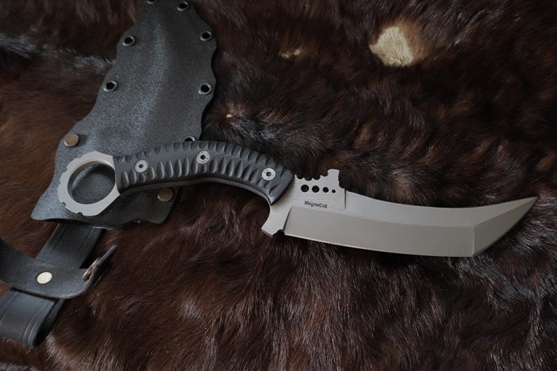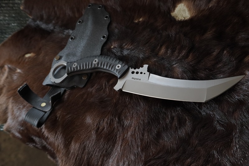 Magnacut - 63 hrc steel. Blade is 138 mm. and handle 135 mm.-G10. kydex sheath. saber flat grind. Finish - satin.